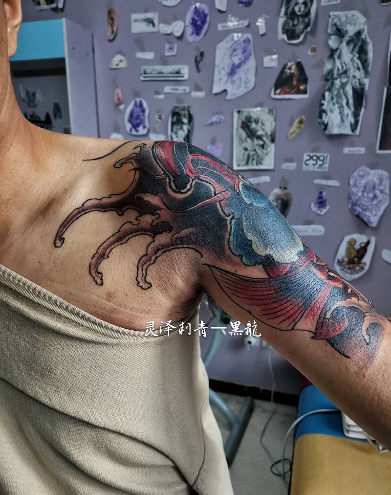 当前位置: 首页 >山西省大同市纹身店-灵泽刺青纹身图案>遮盖毁皮纹身纹身图片_肩部手臂新传统鱼浪花遮盖纹身图案
