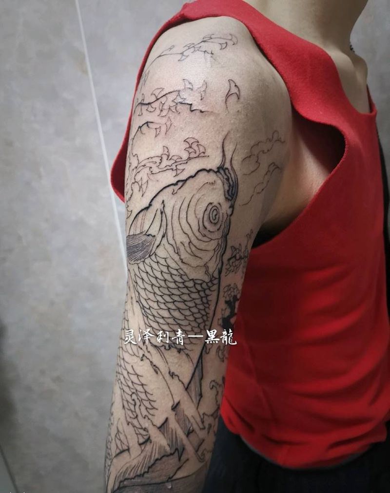 当前位置: 首页 >山西省大同市纹身店-灵泽刺青纹身图案>新传统花臂鲤鱼纹身图片_手臂肩部新传统鱼浪花树纹身图案