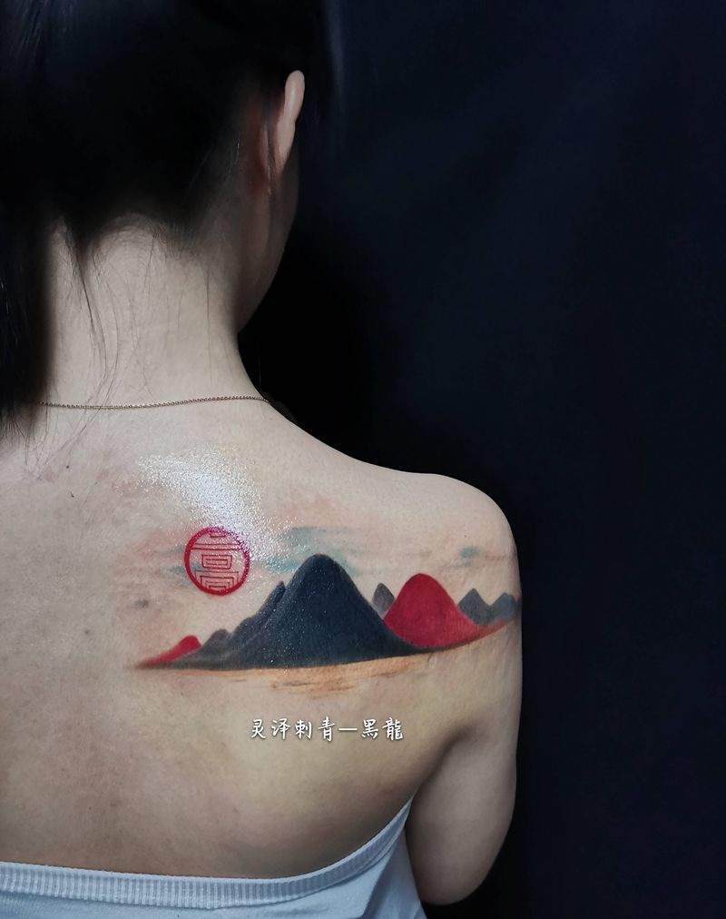 当前位置: 首页 >山西省大同市纹身店-灵泽刺青纹身图案>水墨山纹身图片_肩部背部水墨山太阳云彩纹身图案