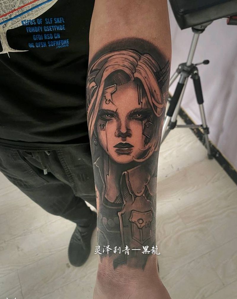 暗黑风格包小臂纹身图片_手臂手部点刺欧美写实暗黑女人纹身图案