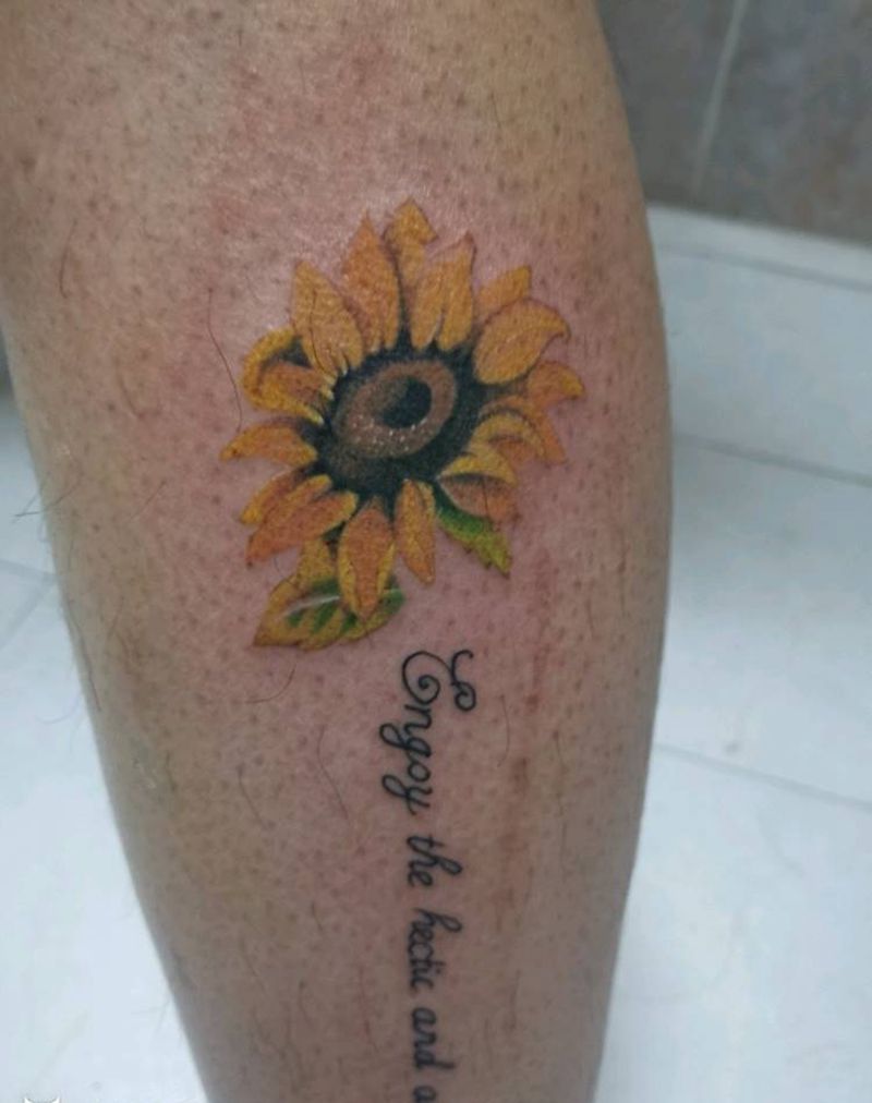 当前位置: 首页 >山西省大同市纹身店-灵泽刺青纹身图案>向日葵纹身图片_脚部水彩花体字向日葵小字母纹身图案