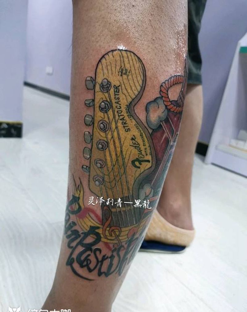 当前位置: 首页 >山西省大同市纹身店-灵泽刺青纹身图案>new school琴头酒瓶纹身图片_腿部New School琴头酒瓶花体字纹身图案
