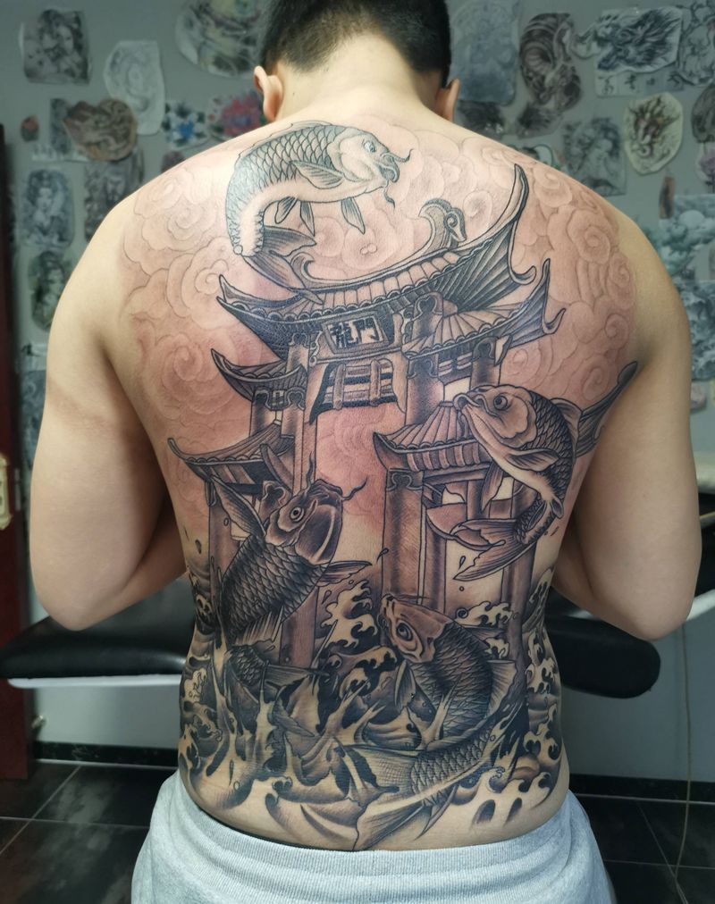 鲤鱼跳龙门纹身图片_背部新传统纹身图案