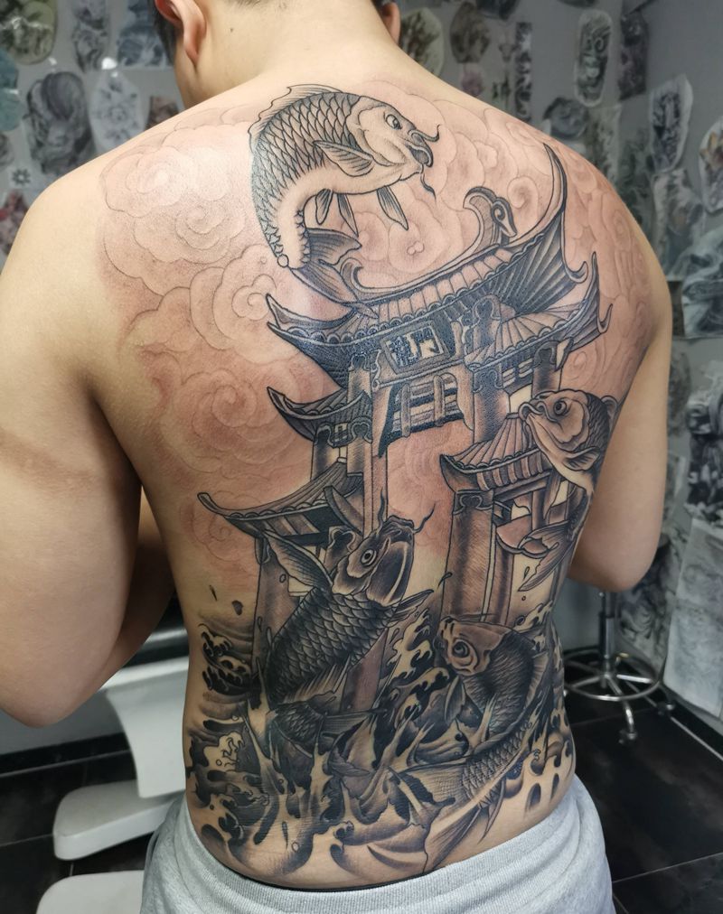 鲤鱼跳龙门纹身图片_背部新传统纹身图案