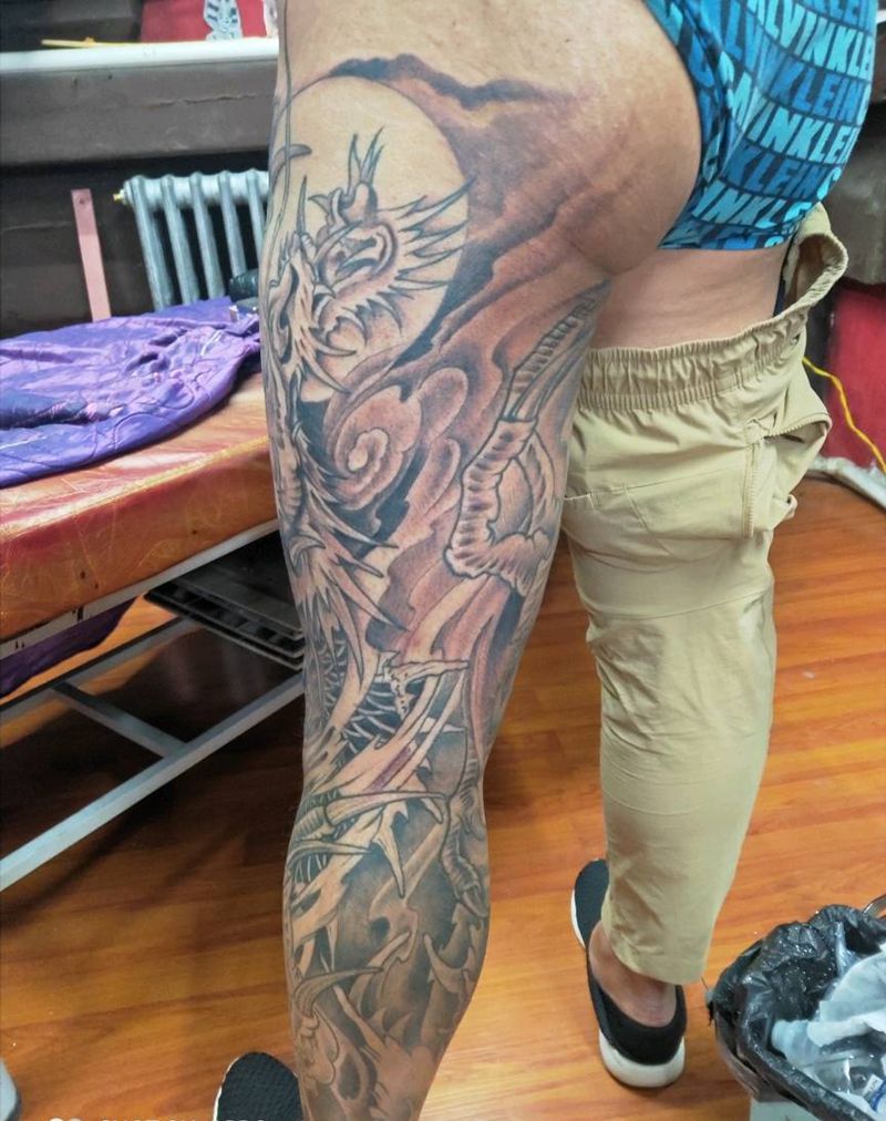 • T网红王老大花腿龙纹身图片_腿部新传统纹身图案