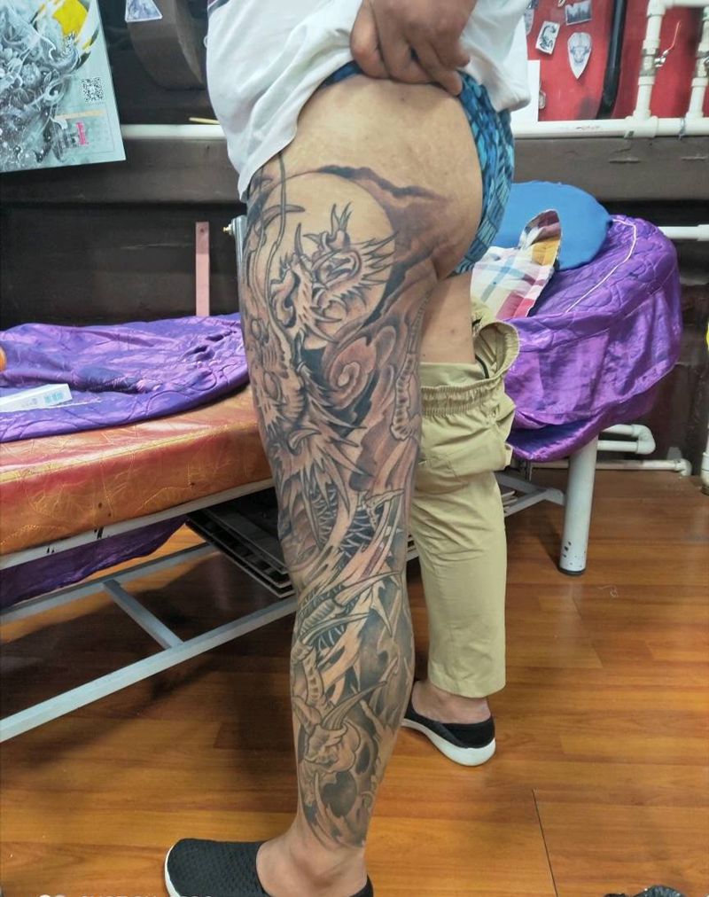 • T网红王老大花腿龙纹身图片_腿部新传统纹身图案