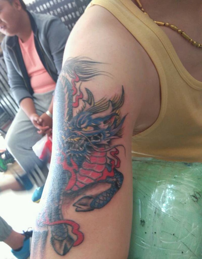• T网红王老大花腿龙纹身图片_腿部新传统纹身图案