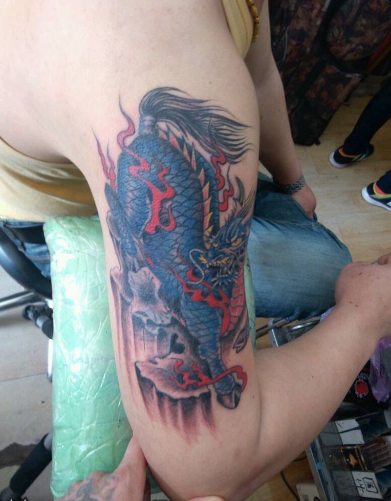 • T网红王老大花腿龙纹身图片_腿部新传统纹身图案