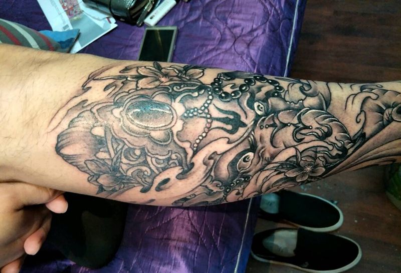 • T网红王老大花腿龙纹身图片_腿部新传统纹身图案