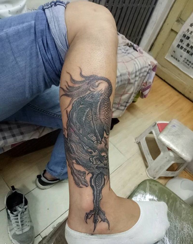 • T网红王老大花腿龙纹身图片_腿部新传统纹身图案