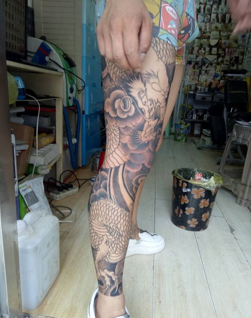 • T网红王老大花腿龙纹身图片_腿部新传统纹身图案