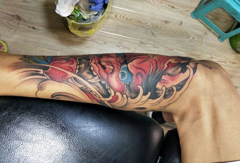 • T网红王老大花腿龙纹身图片_腿部新传统纹身图案