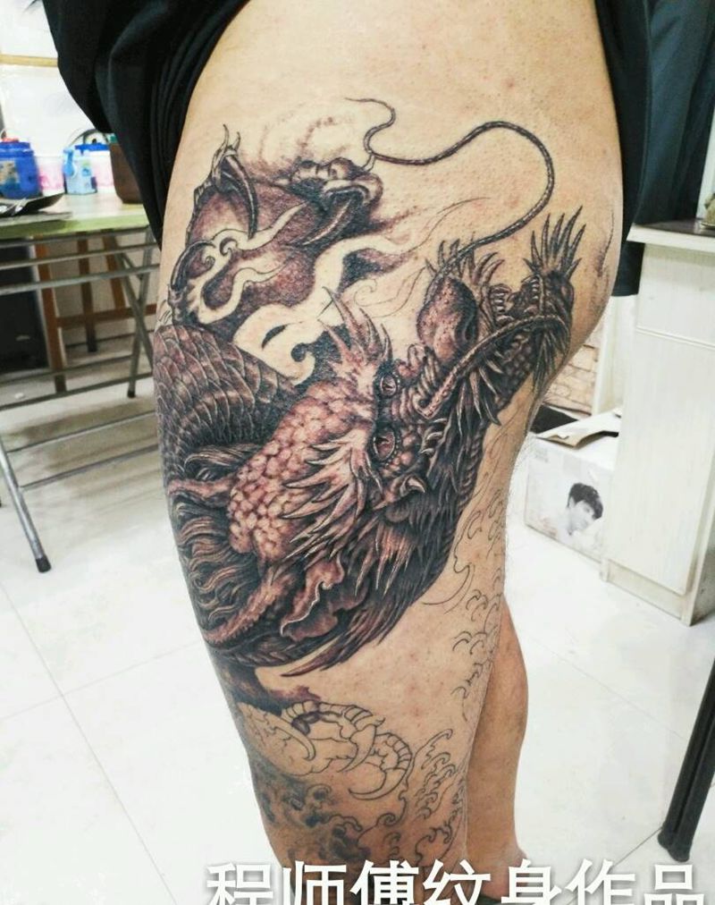 • T网红王老大花腿龙纹身图片_腿部新传统纹身图案