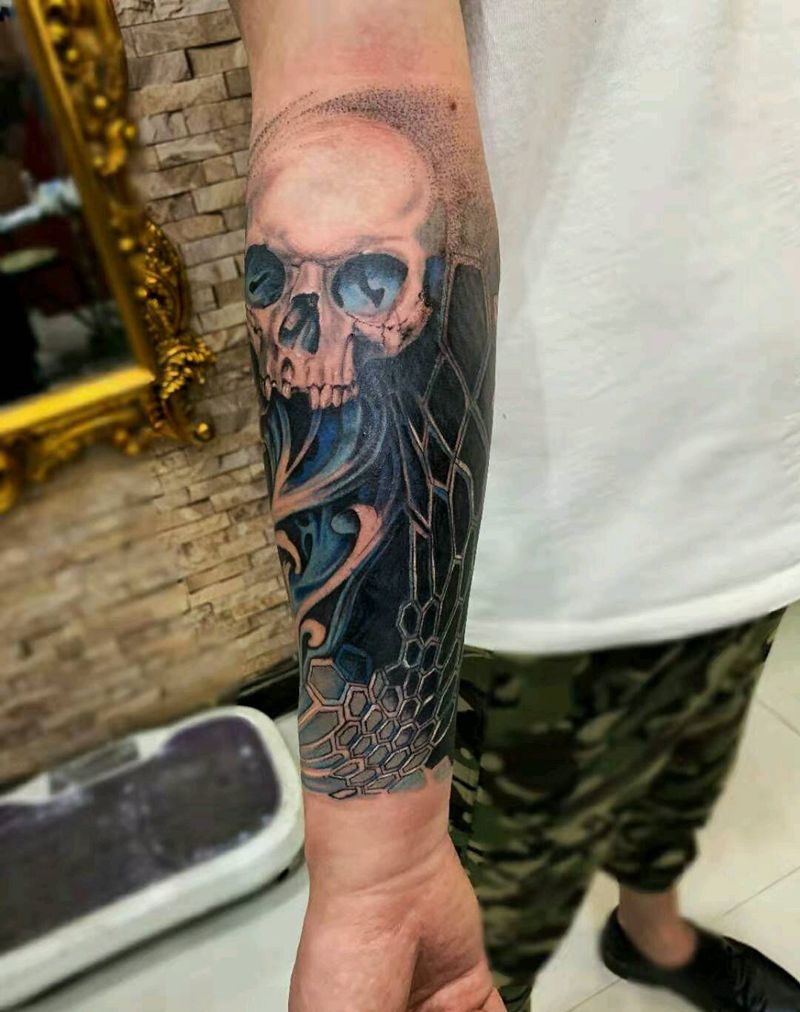 当前位置: 首页 >山西省阳泉市纹身店-程师傅纹艺堂纹身图案>骷髅暴力遮盖纹身图片_手臂欧美写实纹身图案