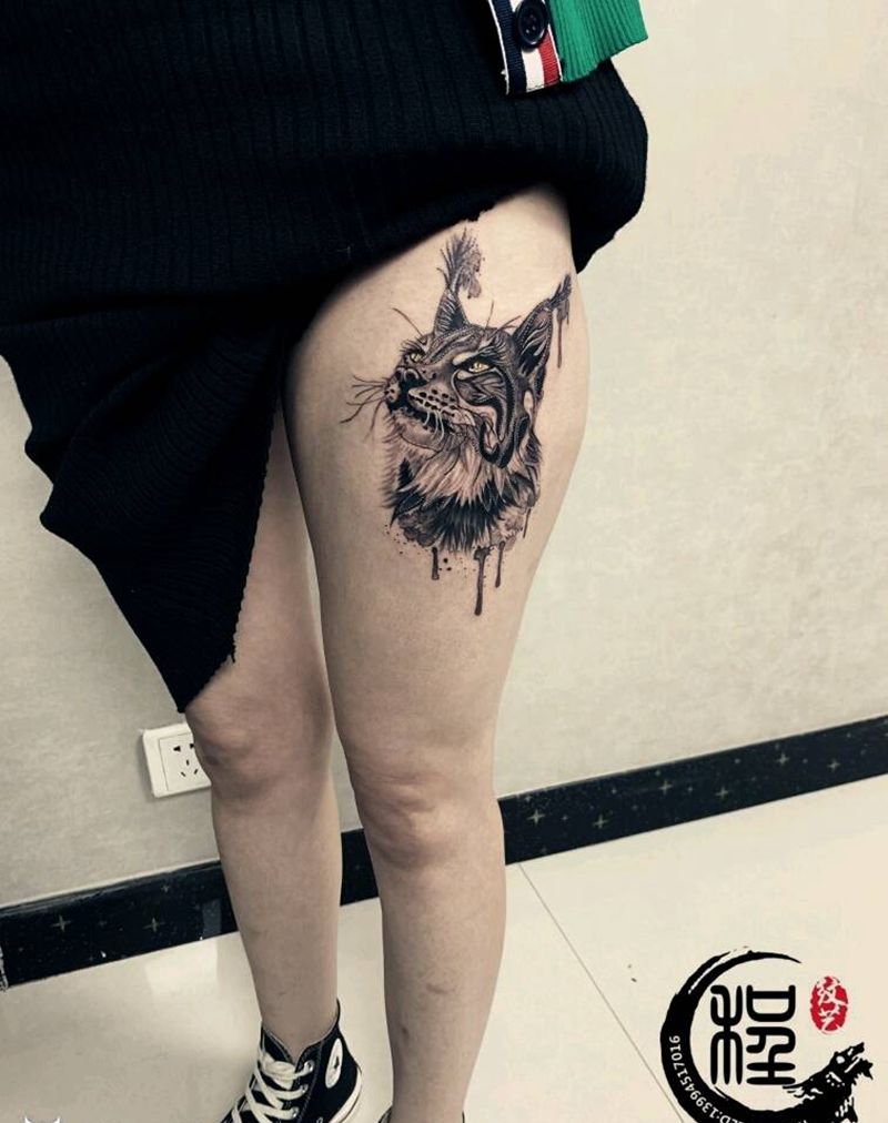 当前位置: 首页 >山西省阳泉市纹身店-程师傅纹艺堂纹身图案>猫纹身图片_腿部新传统纹身图案