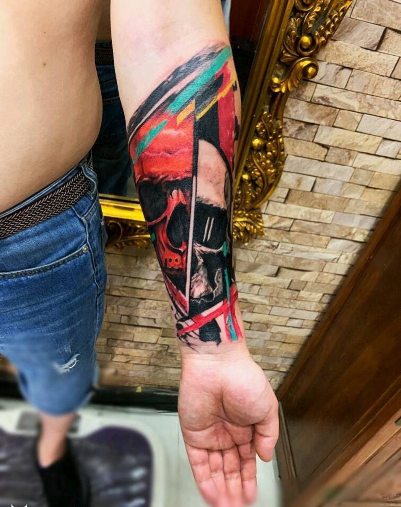 彩色骷髅纹身图片_手臂欧美写实纹身图案