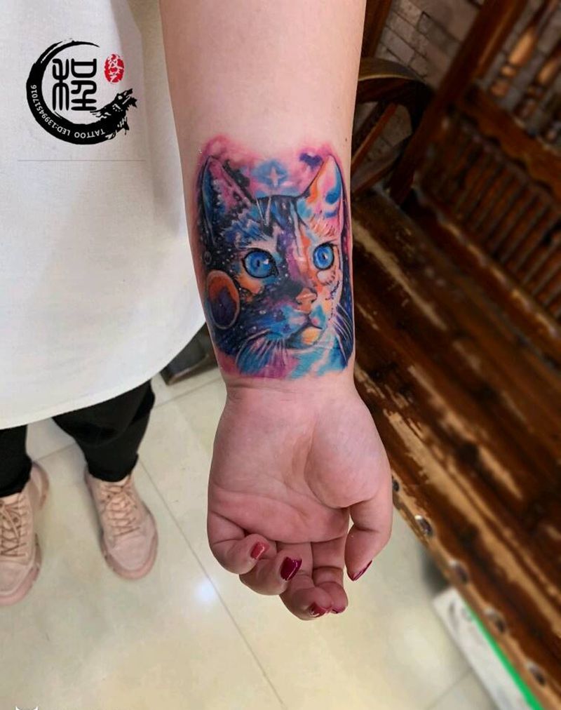 彩猫遮盖纹身图片_手臂欧美写实纹身图案