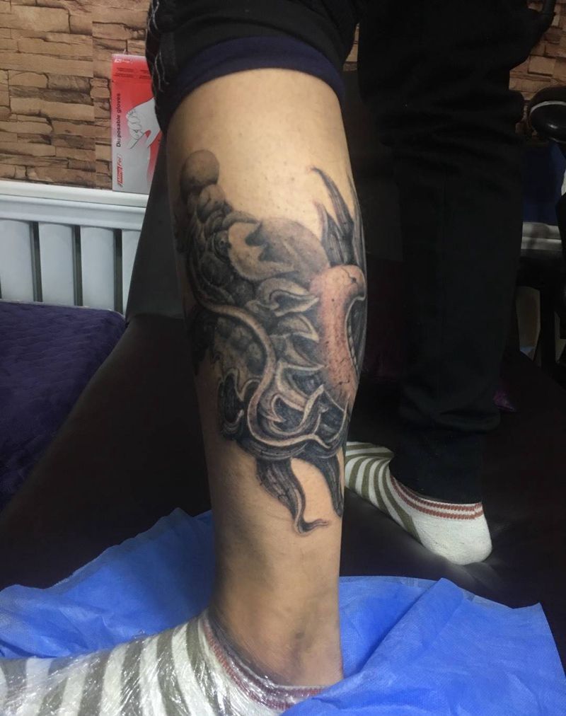 • T网红王老大花腿龙纹身图片_腿部新传统纹身图案