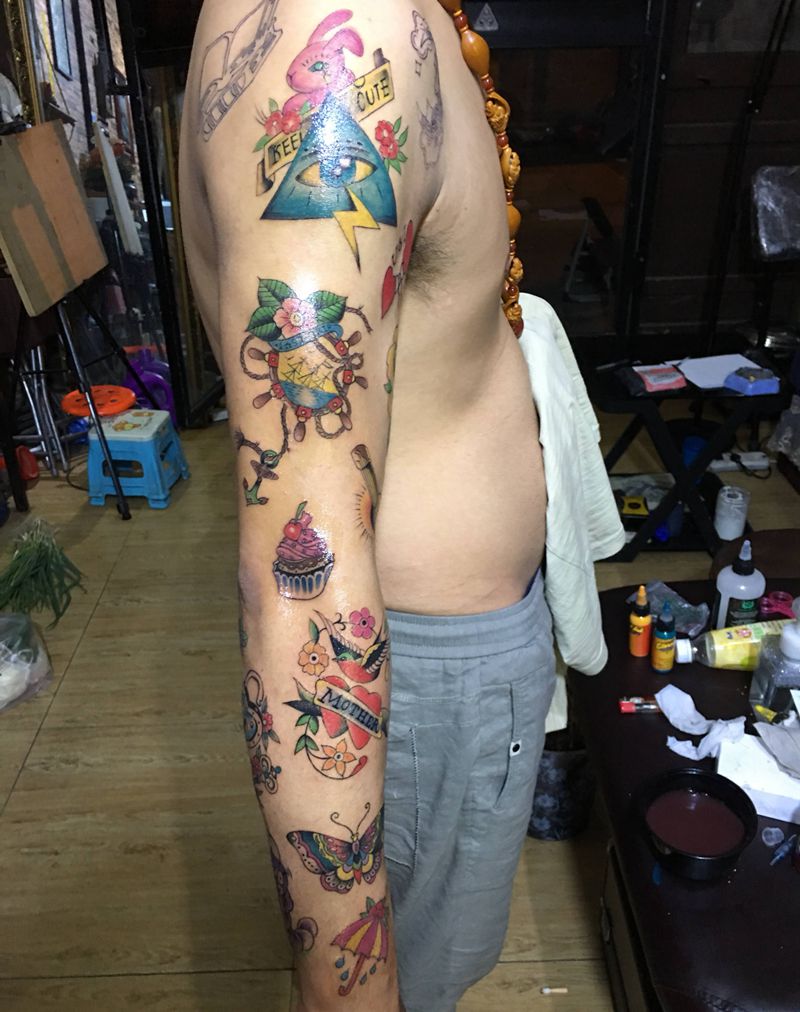 当前位置: 首页 >山西省大同市纹身店-大同老三纹身店纹身图案>小图q纹身图片_手臂Old School纹身图案