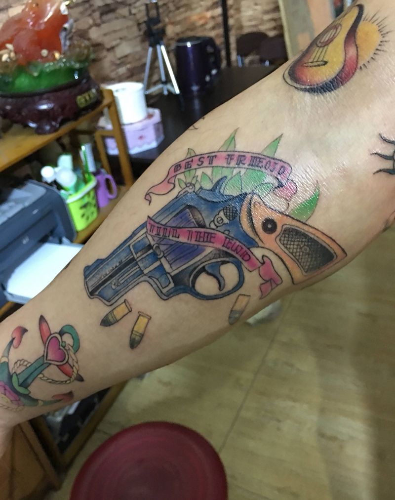 当前位置: 首页 >山西省大同市纹身店-大同老三纹身店纹身图案>小图q纹身图片_手臂Old School纹身图案