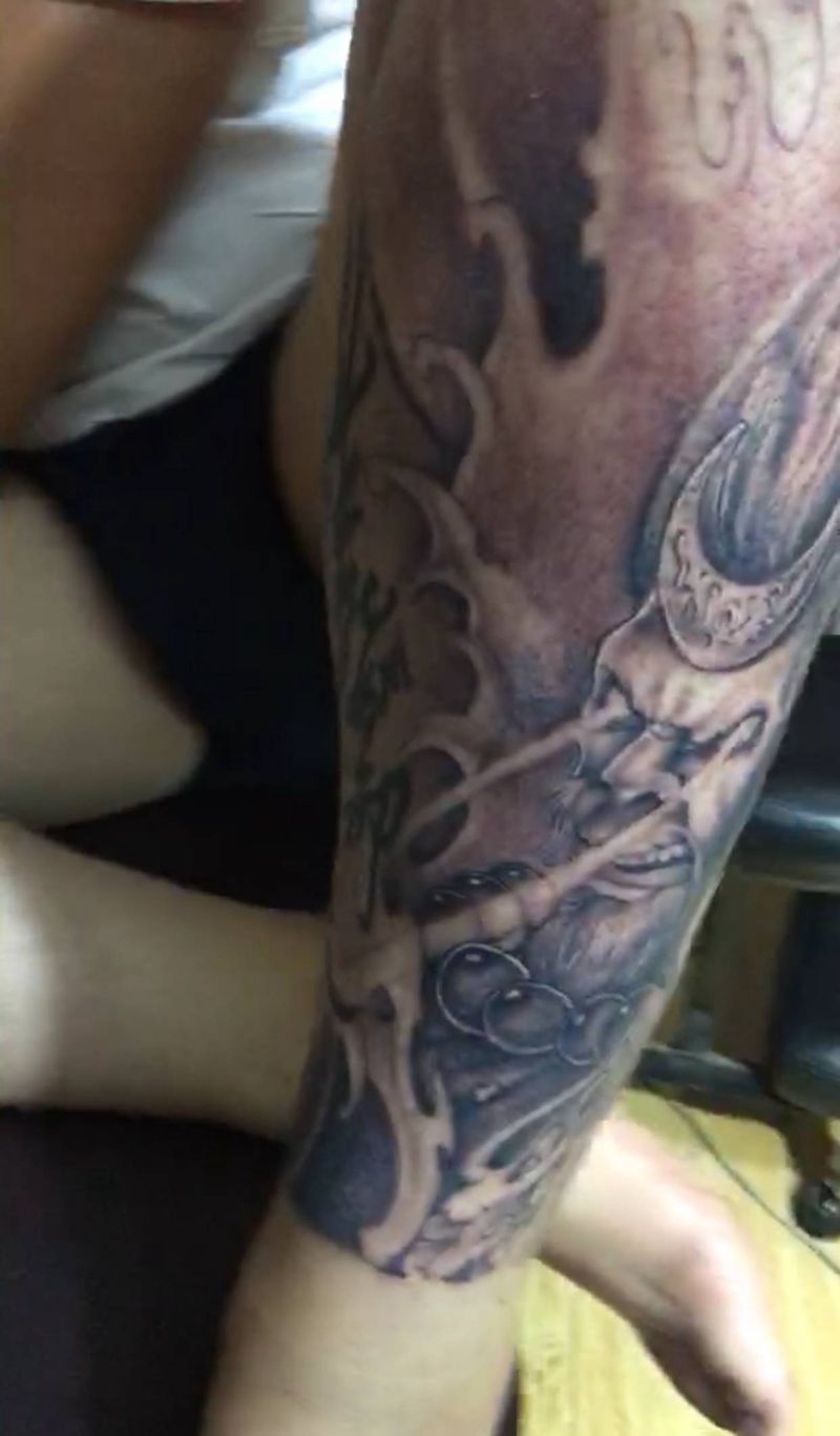 • T网红王老大花腿龙纹身图片_腿部新传统纹身图案