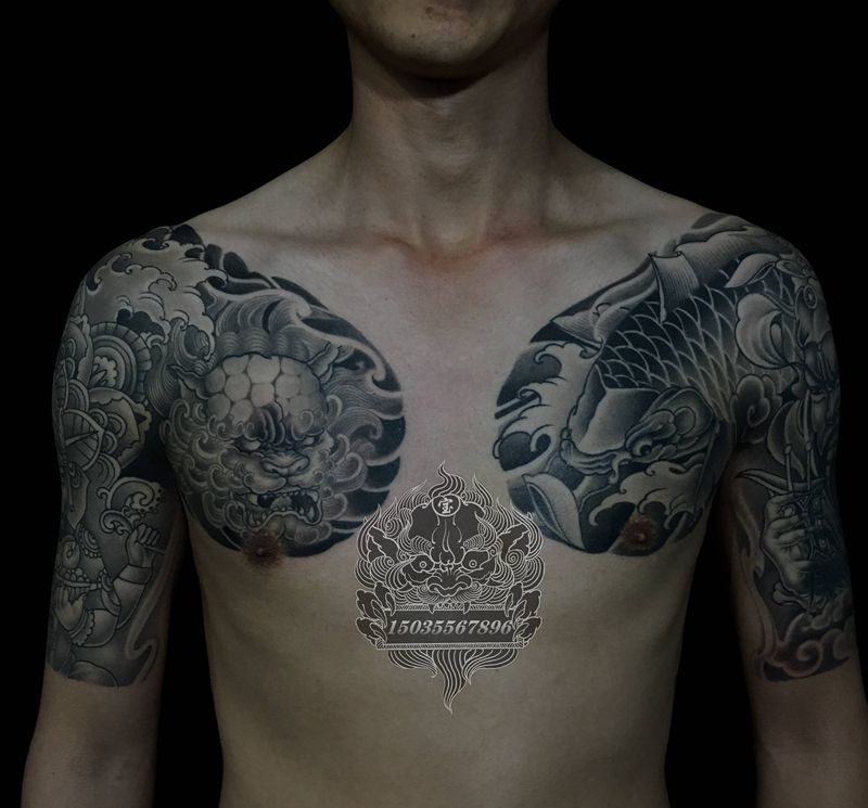 半甲遮盖纹身图片_胸部手臂新传统鱼唐狮关公纹身图案