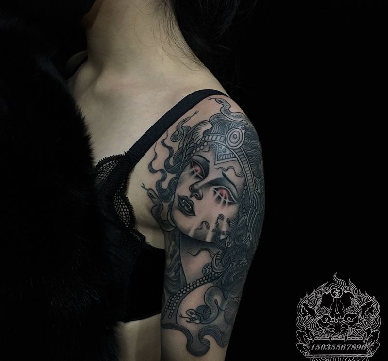 当前位置: 首页 >山西省长治市纹身店-刺青堂纹身纹身图案>美杜莎遮盖纹身图片_手臂肩部New School美杜莎蛇遮盖纹身图案