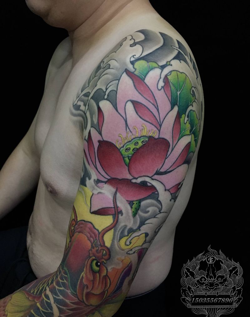 花臂锦鲤纹身图片_手臂手部新传统鱼荷花水浪纹身图案