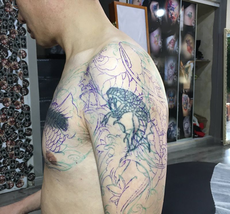 当前位置: 首页 >山西省长治市纹身店-刺青堂纹身纹身图案>半甲锦鲤遮盖纹身图片_胸部手臂新传统鱼枫叶浪花纹身图案