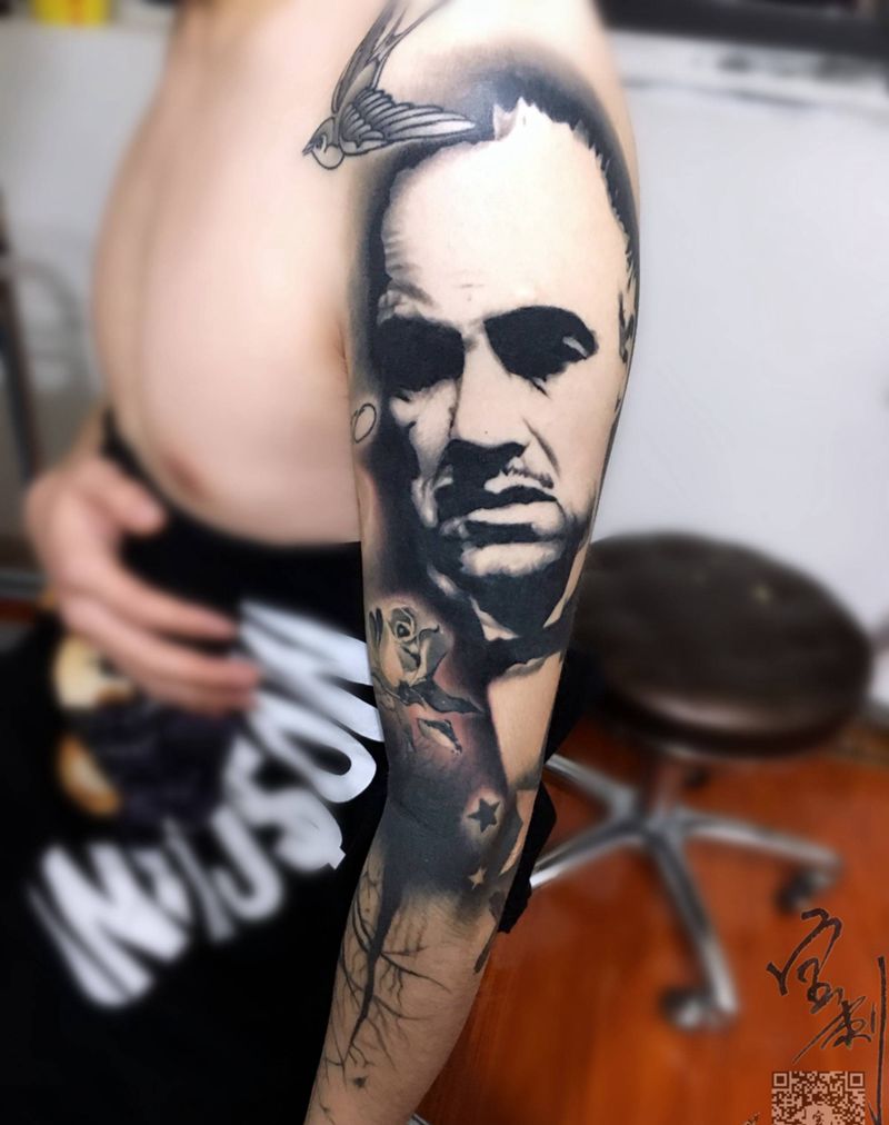 当前位置: 首页 >山西省长治市纹身店-刺青堂纹身纹身图案>教父纹身图片_手臂肩部欧美写实教父肖像纹身图案