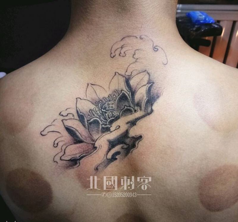 当前位置: 首页 >山西省大同市纹身店-大同老三纹身店纹身图案>荷花纹身图片_背部肩部新传统水墨荷花纹身图案