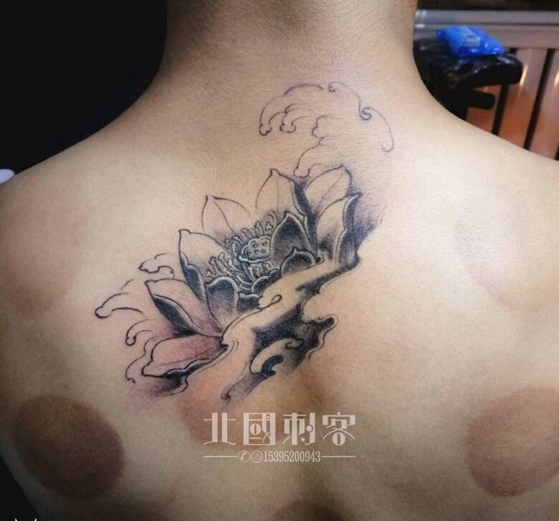 当前位置: 首页 >山西省大同市纹身店-大同老三纹身店纹身图案>荷花纹身图片_背部肩部新传统水墨荷花纹身图案