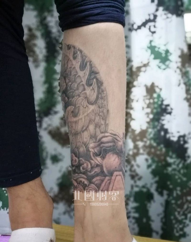当前位置: 首页 >山西省大同市纹身店-大同老三纹身店纹身图案>石雕龙包小腿纹身图片_腿部新传统老传统纹身图案