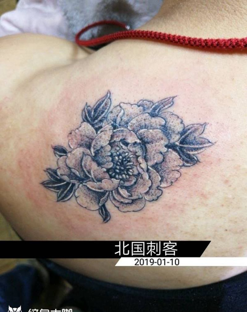 点刺牡丹纹身图片_肩部背部点刺图腾纹身图案