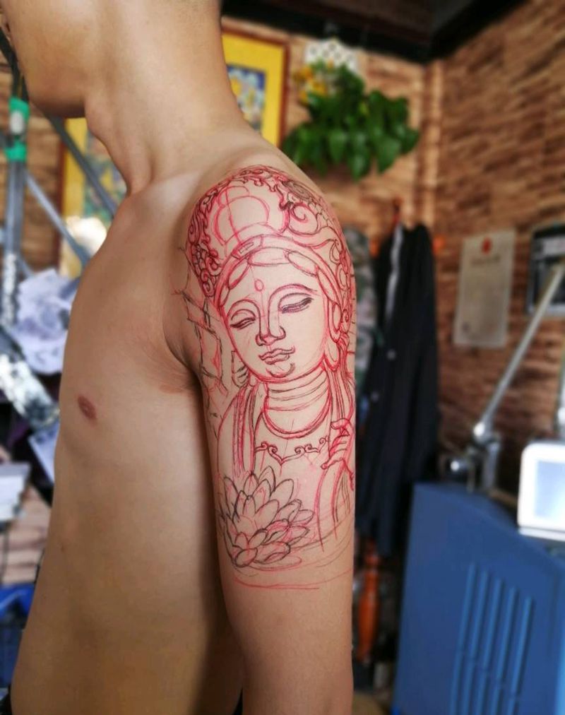 石雕普贤菩萨纹身图片_手臂肩部新传统欧美写实石雕普贤菩萨石雕菩萨纹身图案