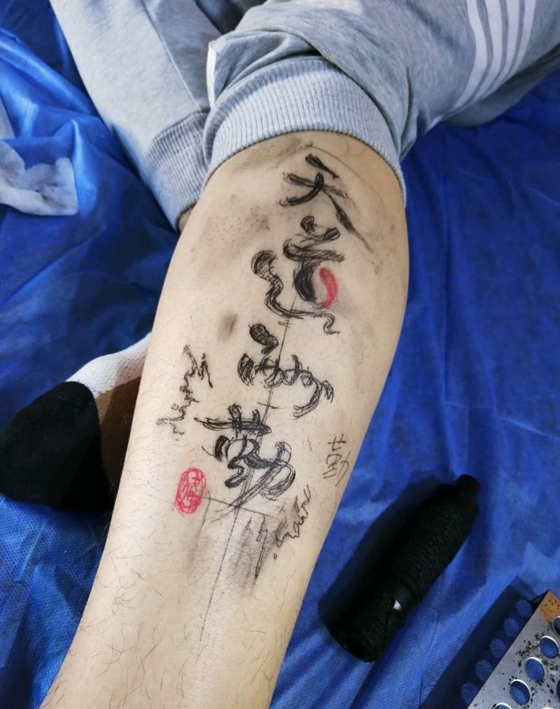 天道酬勤纹身图片_脚部腿部水墨新传统天道酬勤泼墨纹身图案