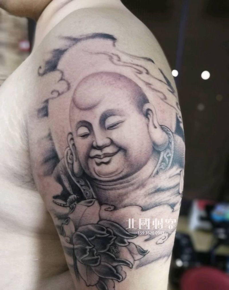 当前位置: 首页 >山西省大同市纹身店-大同老三纹身店纹身图案>弥勒纹身图片_肩部手臂老传统新传统弥勒佛佛大臂佛纹身图案