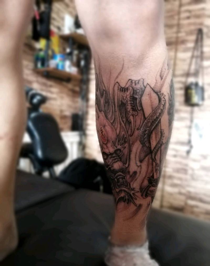 • T网红王老大花腿龙纹身图片_腿部新传统纹身图案