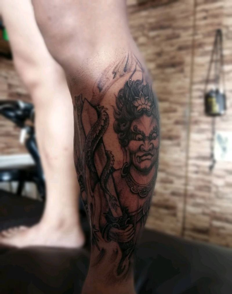当前位置: 首页 >山西省大同市纹身店-大同老三纹身店纹身图案>不动明王纹身图片_腿部脚部老传统新传统不动明王小腿纹身纹身图案