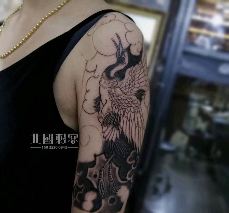 传统仙鹤未完成纹身图片_手臂肩部老传统新传统仙鹤日式仙鹤纹身图案