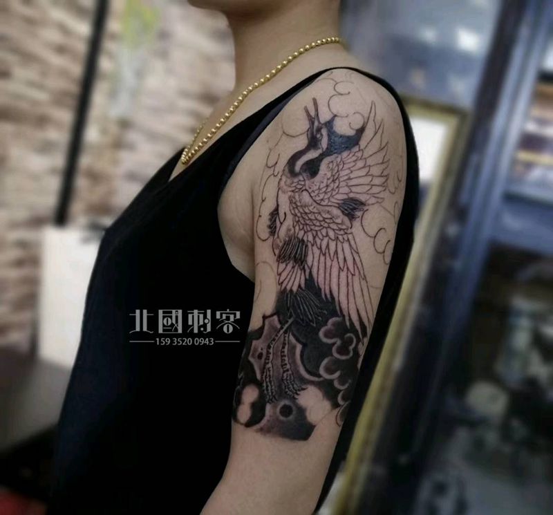 当前位置: 首页 >山西省大同市纹身店-大同老三纹身店纹身图案>传统仙鹤未完成纹身图片_手臂肩部老传统新传统仙鹤日式仙鹤纹身图案