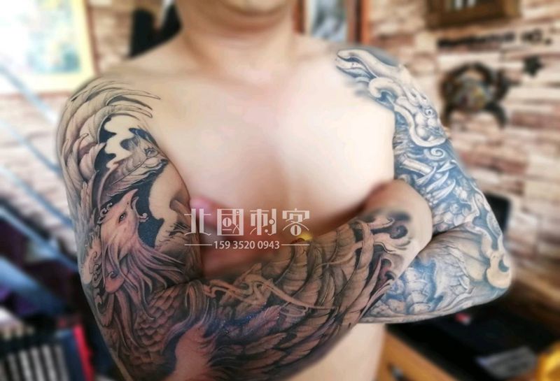 当前位置: 首页 >山西省大同市纹身店-大同老三纹身店纹身图案>雕龙画凤纹身图片_肩部手臂新传统老传统龙凤龙凤花臂纹身图案