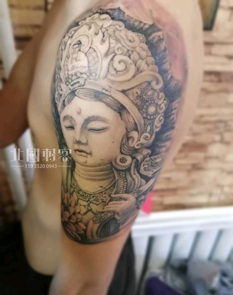 当前位置: 首页 >山西省大同市纹身店-大同老三纹身店纹身图案>石雕普贤菩萨纹身图片_肩部手臂老传统新传统普贤菩萨石雕菩萨纹身图案