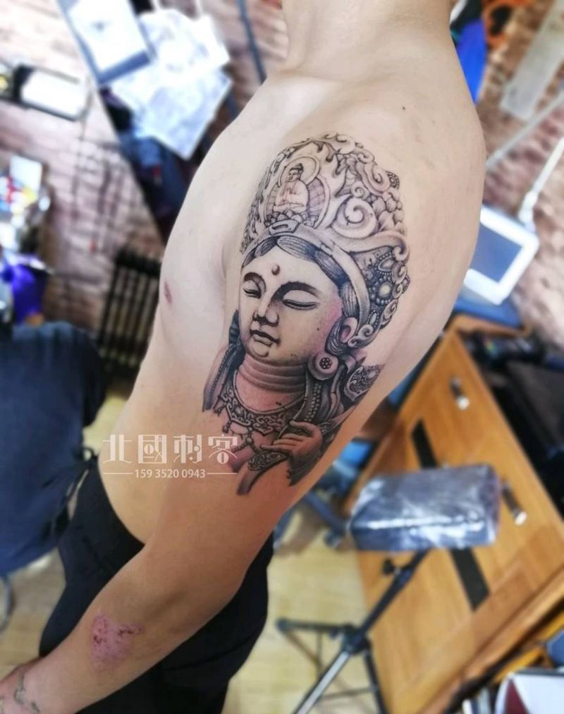 石雕普贤菩萨第二次纹身图片_手臂肩部新传统老传统石雕普贤菩萨石雕菩萨纹身图案