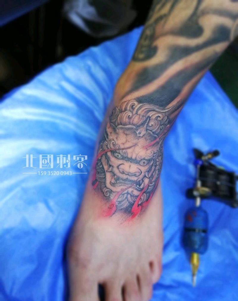唐狮纹身图片_脚部腿部老传统新传统唐狮脚面纹身脚面唐狮纹身图案
