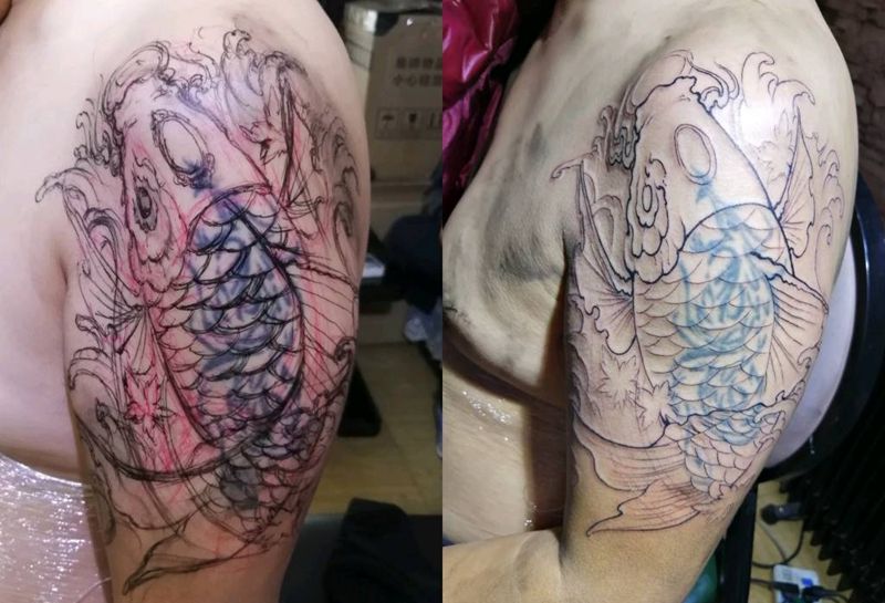 当前位置: 首页 >山西省大同市纹身店-大同老三纹身店纹身图案>鲤鱼遮盖纹身图片_手臂肩部新传统老传统鲤鱼遮盖彩色鲤鱼纹身图案