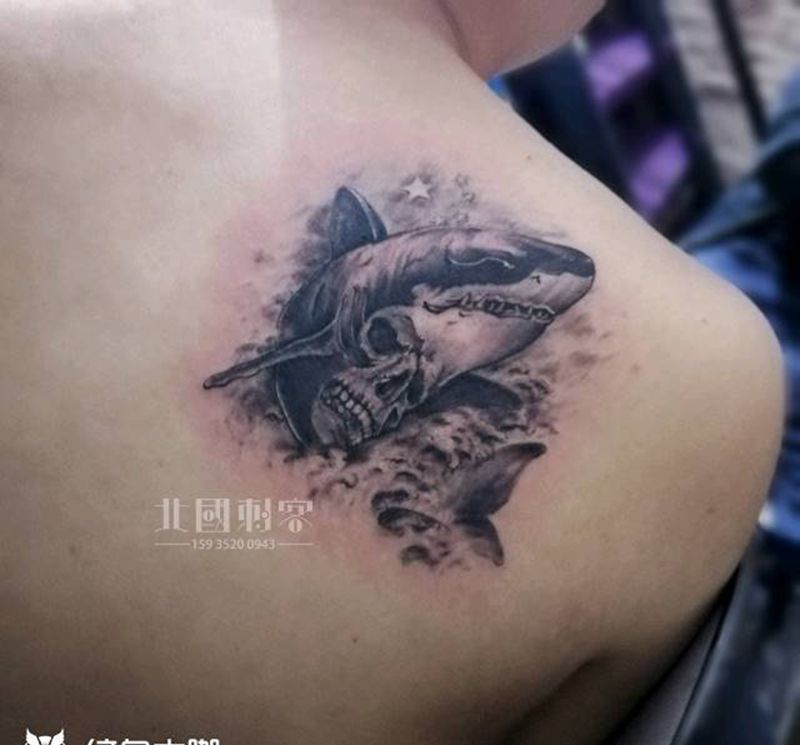 当前位置: 首页 >山西省大同市纹身店-大同老三纹身店纹身图案>鲨鱼纹身图片_肩部背部欧美写实点刺鲨鱼纹身图案