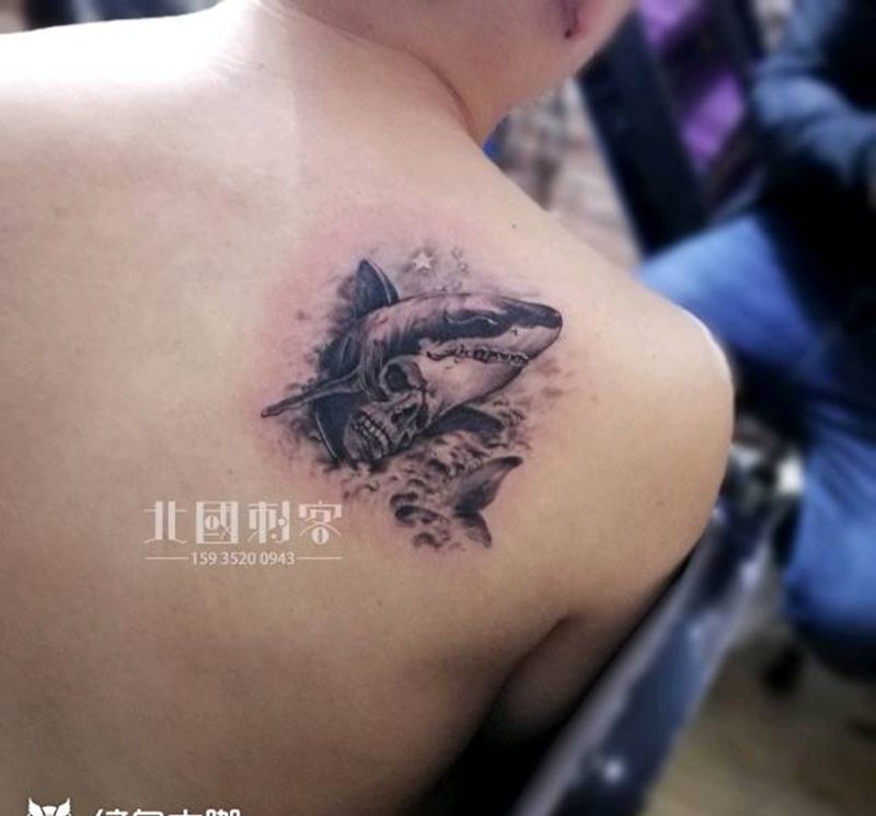 当前位置: 首页 >山西省大同市纹身店-大同老三纹身店纹身图案>鲨鱼纹身图片_肩部背部欧美写实点刺鲨鱼纹身图案