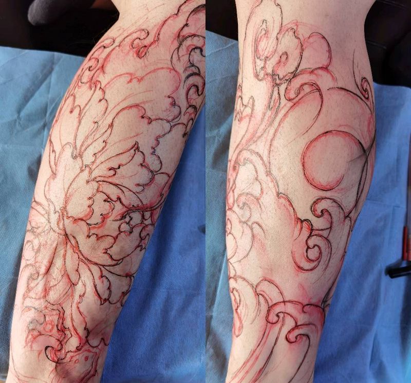 当前位置: 首页 >山西省大同市纹身店-大同老三纹身店纹身图案>牡丹遮疤纹身图片_脚部新传统老传统牡丹包小腿纹身图案