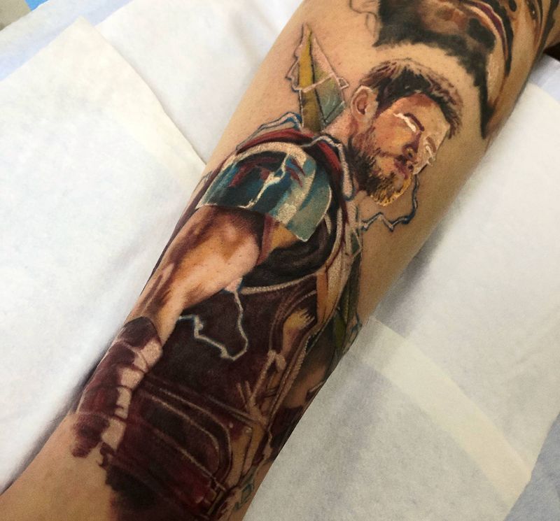 雷神纹身图片_腿部欧美写实雷神复仇者联盟纹身图案